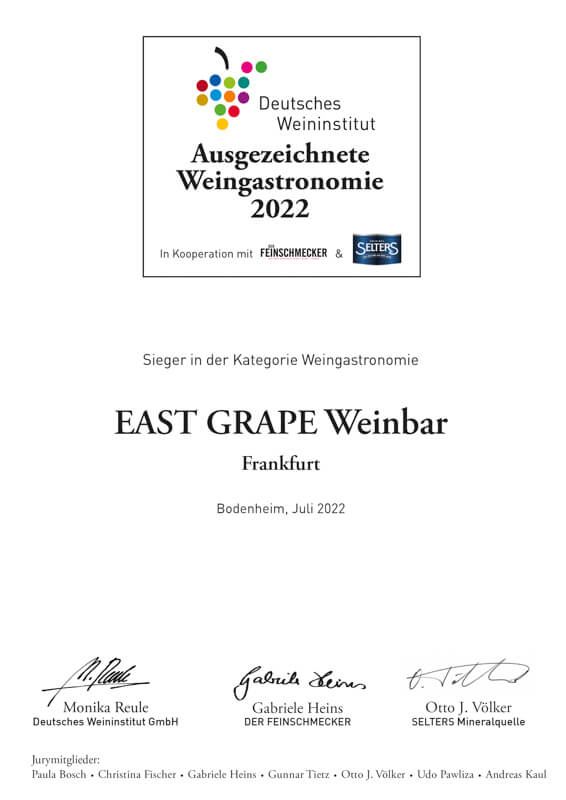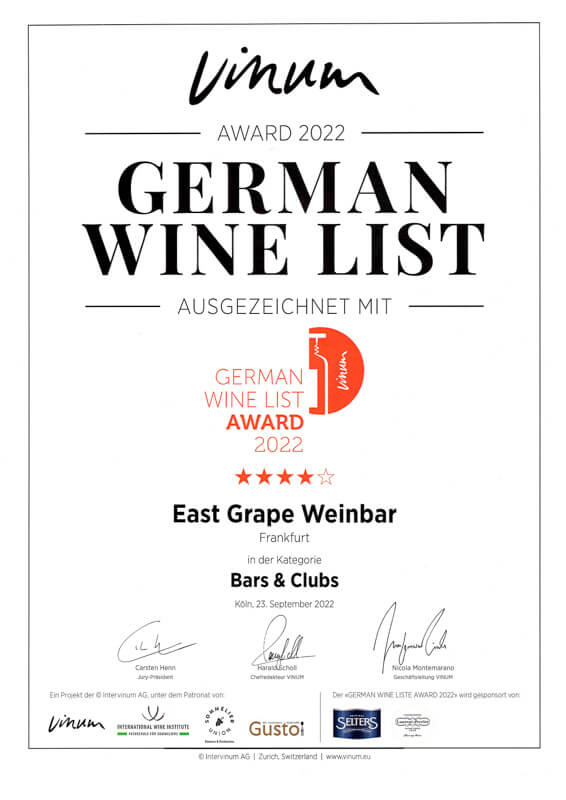 Leckere Weine, Snacks und super Service! Warme, gemütliche und entspannte Atmosphäre mit angenehmer Musik. Der Besitzer kennt sich aus und man wird super beraten. Spezialisiert auf deutsche Weine. Hier gibt es eine gute Auswahl auch an hochwertigen Weinen (auch einige GGs) und nicht nur Schoppen-Weine wie in den meisten Wein-Locations in Frankfurt.
